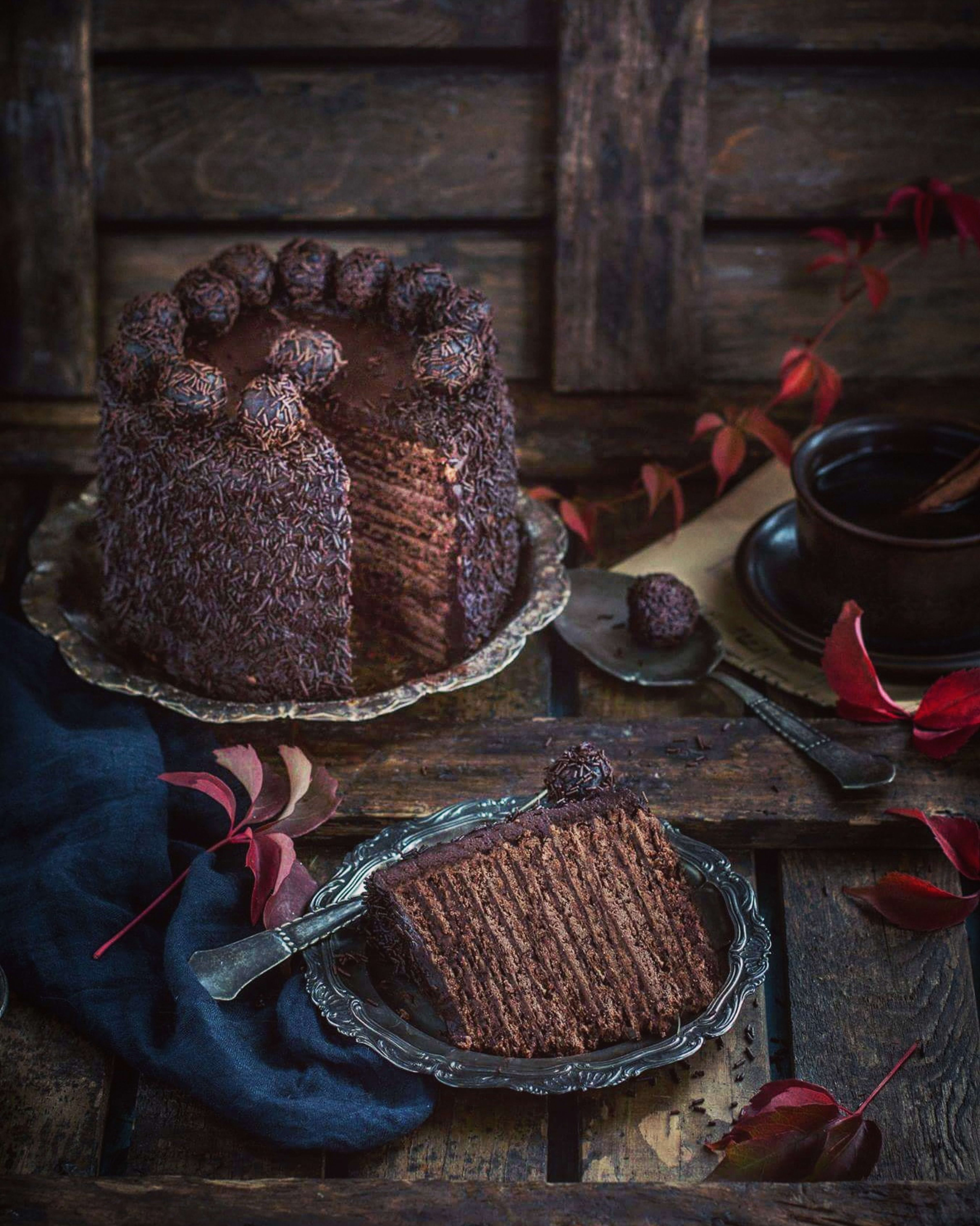 Tilslutt strø over med sjokoladestrøssel og pynt med sjokolade truffler.