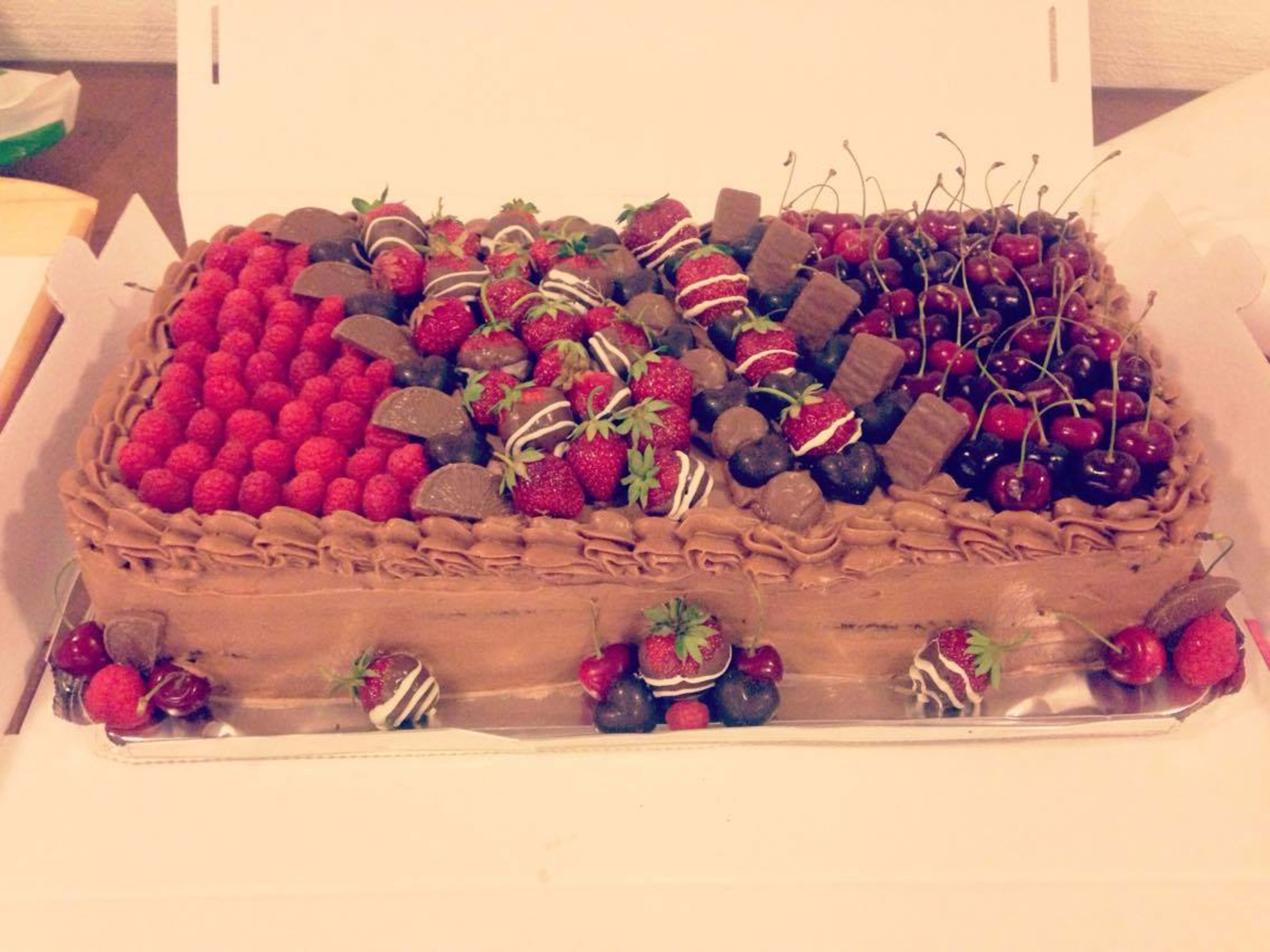 10: Dekk så kaken med krem uttapå og pynt etter ønsket med bær og sjokolade