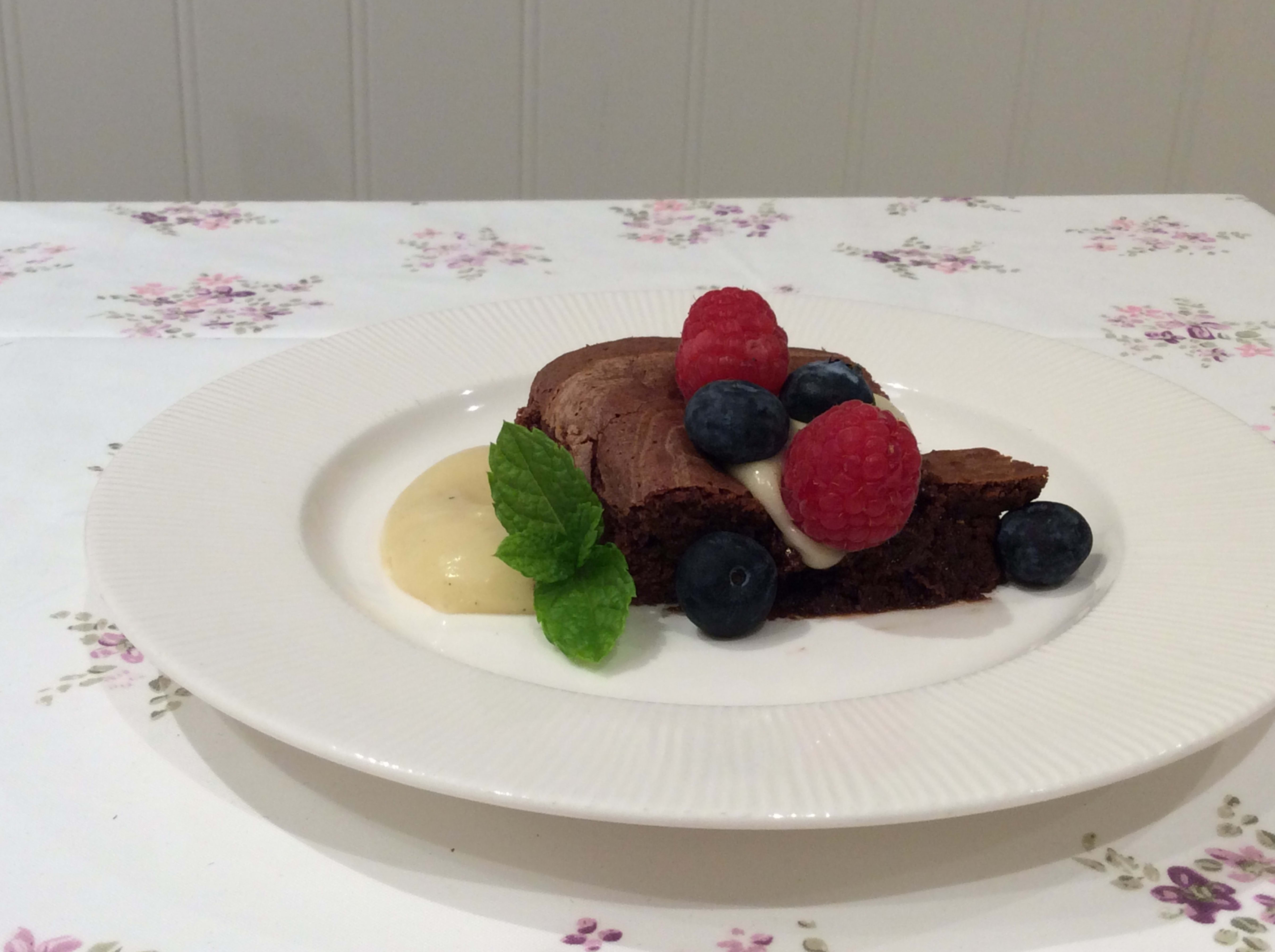 Smelt sjokolade og smør i vannbad. Pisk egg og sukker til eggedosis. Sikt i mel og bakepulver. Bruk en rund form, 24 cm i diameter, stek på 225 grader i 12-15 minutter (heller for lite enn for mye!) Avkjøl helt, gjerne i kjøleskap over natten.