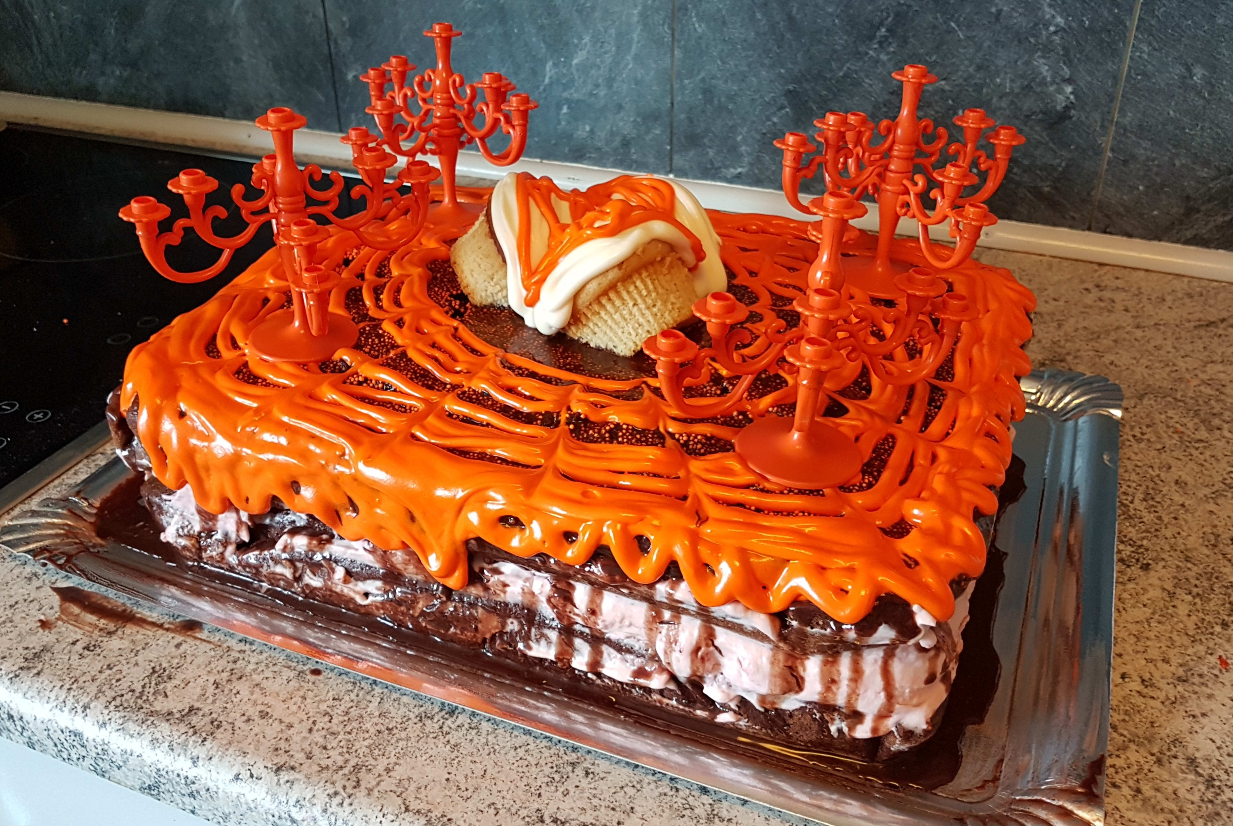 Tilslutt sprøytes den oransje frostingen på, jeg hadde den litt flytende slik at den rant litt ned på kantene.