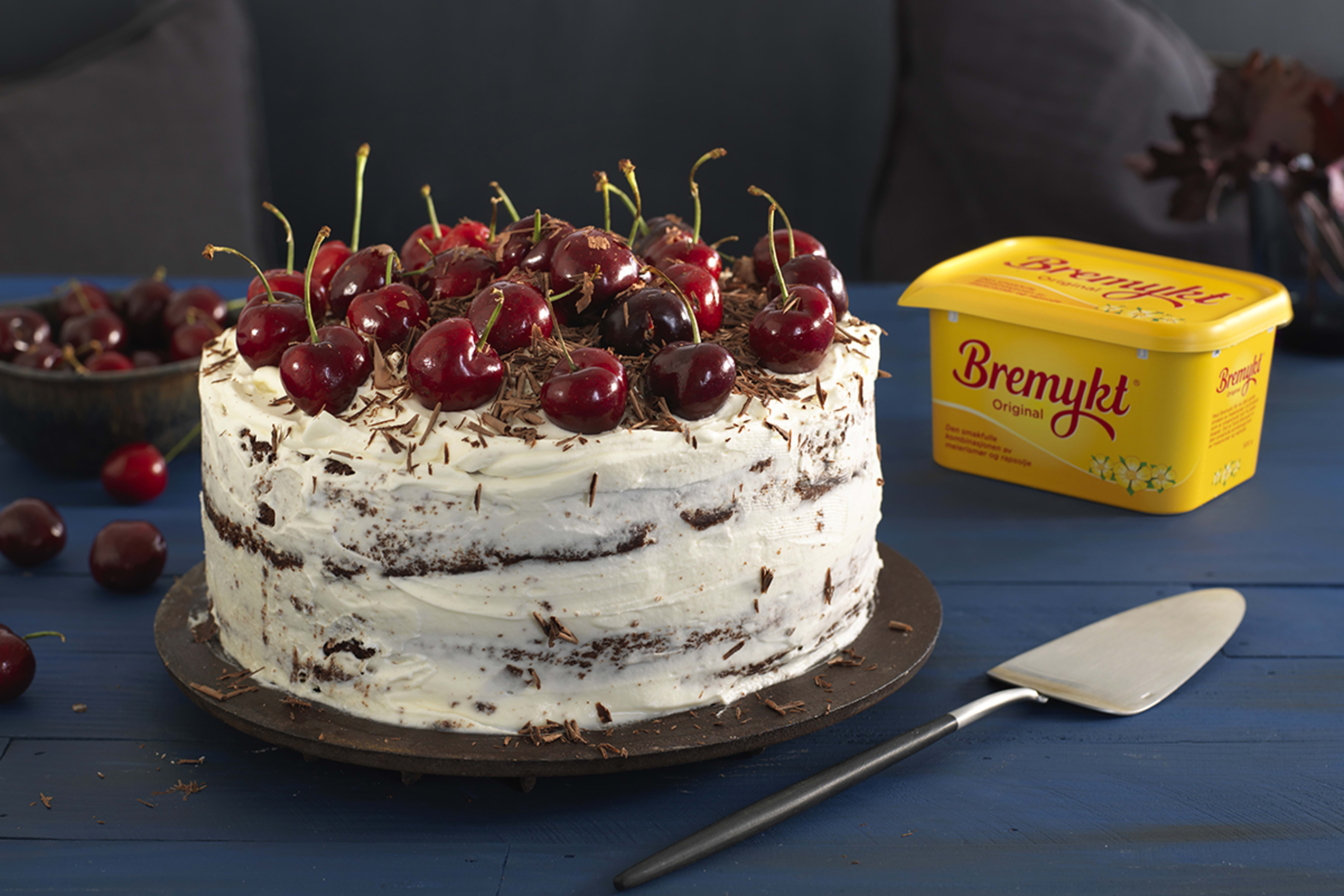 Ha Bremykt og sukker i en miksebolle, pisk på høy hastighet i 4-5 minutter til det er lyst og luftig. Skrap ned det som legger seg på kantene. Tilsett ett og ett egg, pisk godt mellom hvert. Rør inn rømme og til slutt de tørre ingrediensene vekselsvis med sjokoladeblandingen. Fordel røren i de to formene. Stek kakene på midterste rille ca. 40 minutter. Sjekk med en kakepinne, det skal ikke sitte igjen deig. Avkjøl kakebunnene 10-15 minutter i forma og så videre på rist.