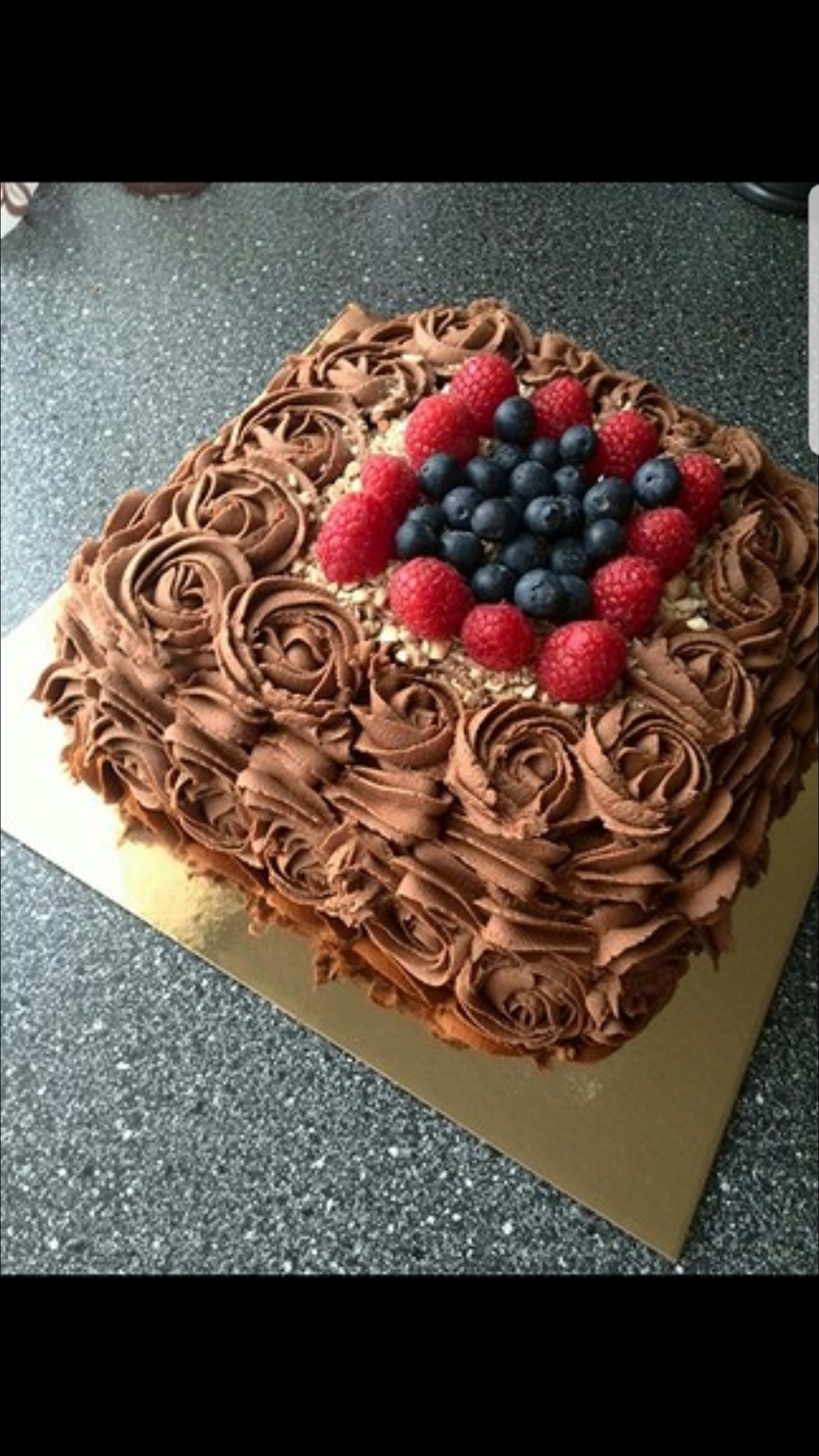 5. Del kaken i lag og fordel kremen i hvert lag. Gjerne med en sprøytepose for å få en rett kake og like mye krem i hvert lag. Du kan ha bringebær mellom hver lag, det passer perfekt med kaffesmaken. Pynt kaken etter ønske. Vel bekomme