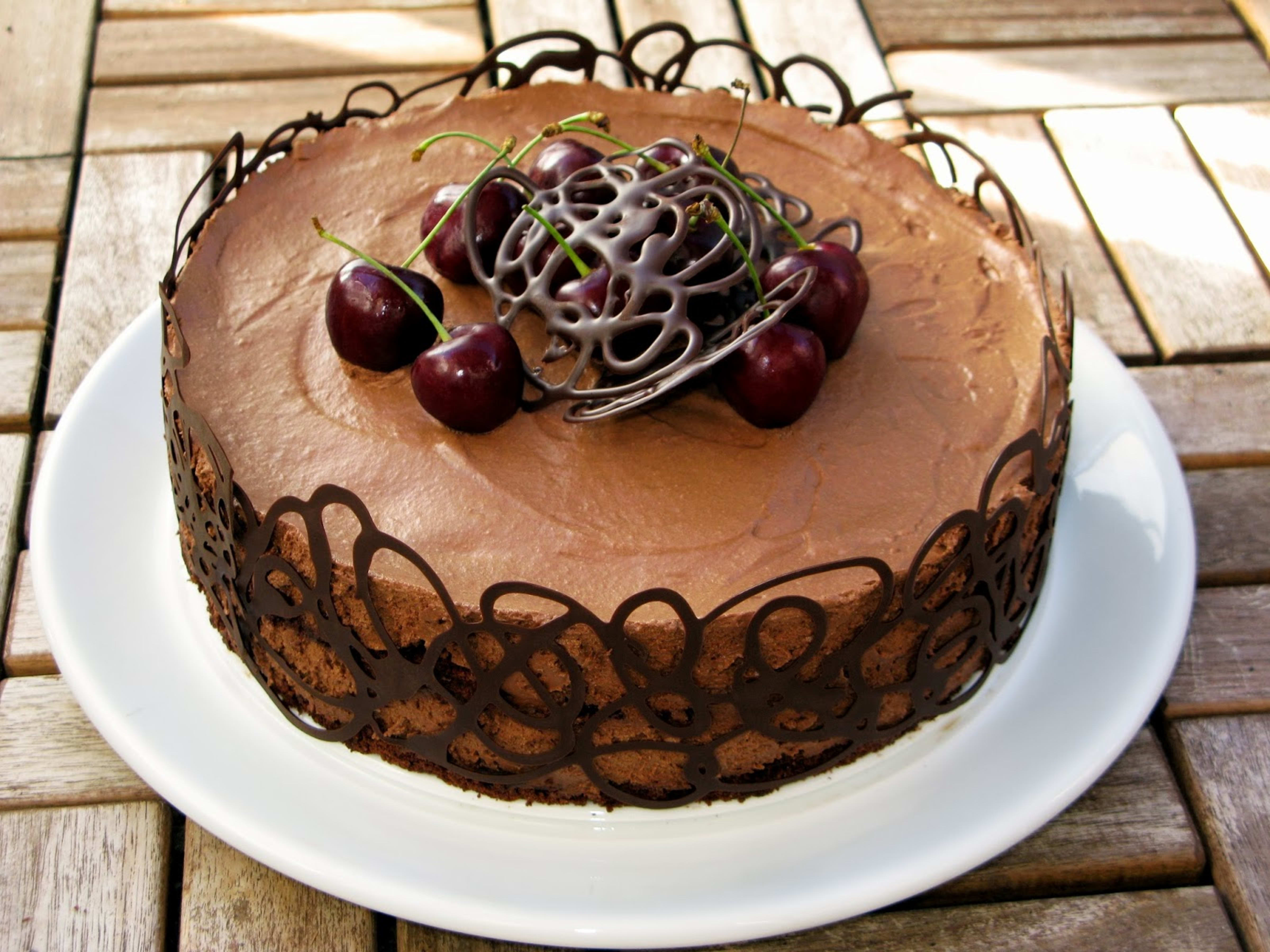 Pynt toppen med resten av morellene og litt sjokolade border. La kaken stå i kjøleskapet i 20 minutter før servering.
